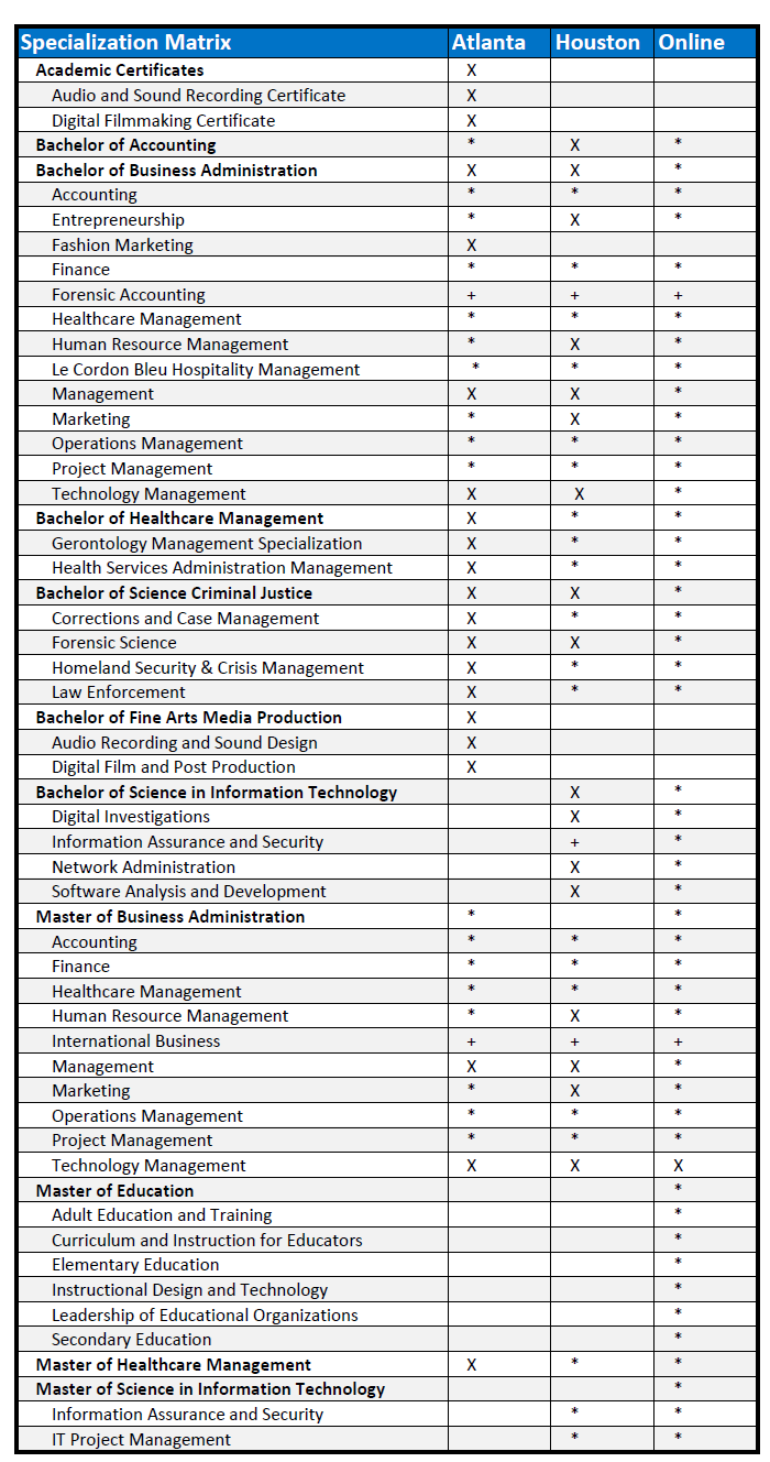 x Specializations may be available at the campus or online: please see campus schedule for course offerings.