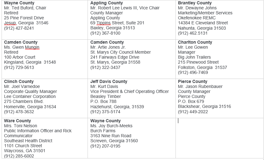 Coastal Pines Technical College’s Board of Directors is composed of members representing the college’s designated thirteen-county service area.