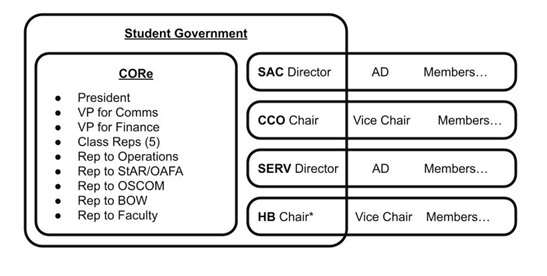 Student Government at Olin is comprised of a governing body, known as the Council of Olin Representatives (CORe), as well as four Student Experience Organizations. The purpose of each Student Experience Organization is unique, as they individually have their own missions and functions, however, each of these organizations is deemed vital to the education and college experience of the student body as they all address aspects of Olin's central philosophies, founding precepts, and goals. The four Student Experience Organizations at Olin include the Honor Board, the Student Activities Council (SAC), the Club Council (CCo), and the organization to Support, Encourage, and Recognize Volunteerism (SERV).